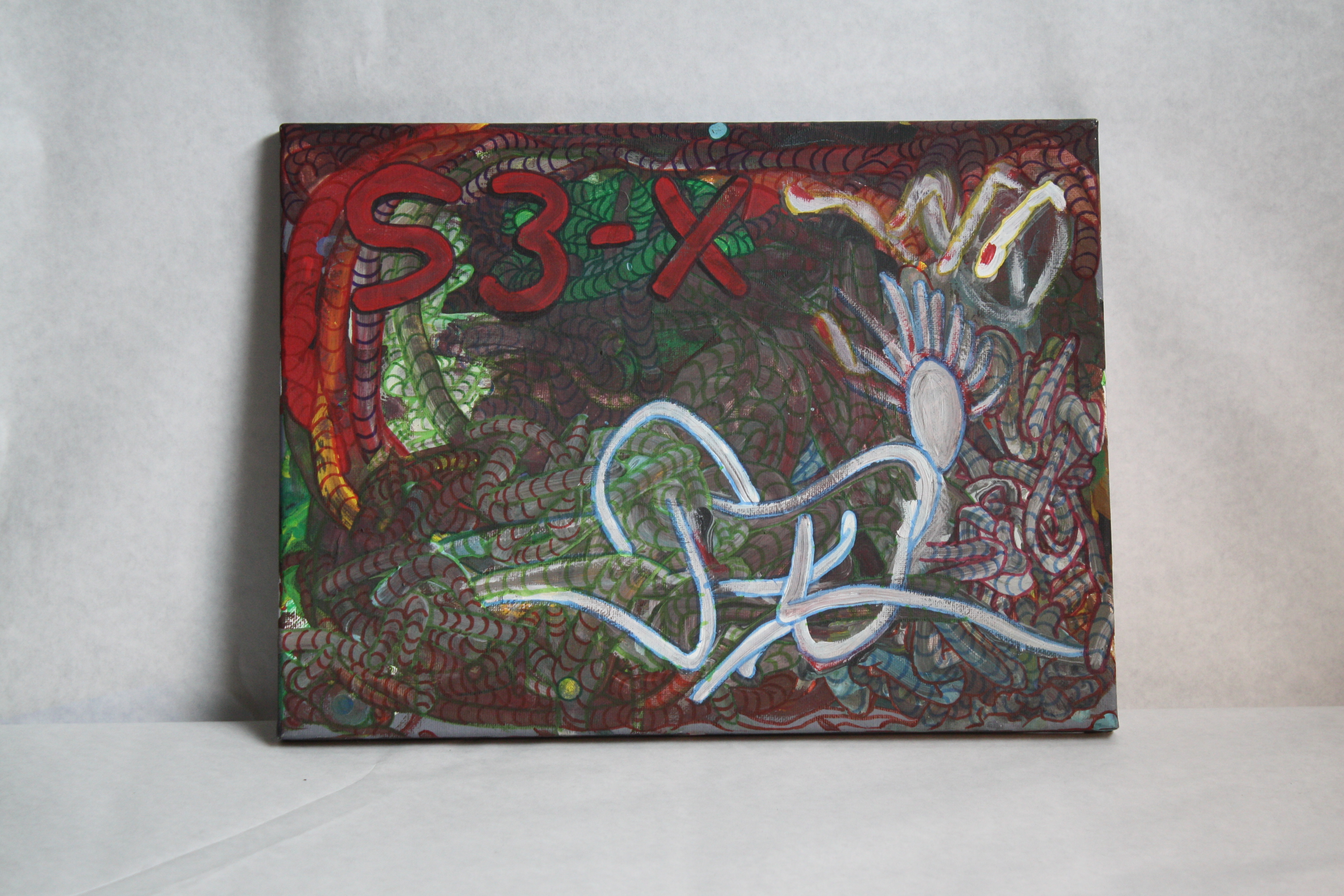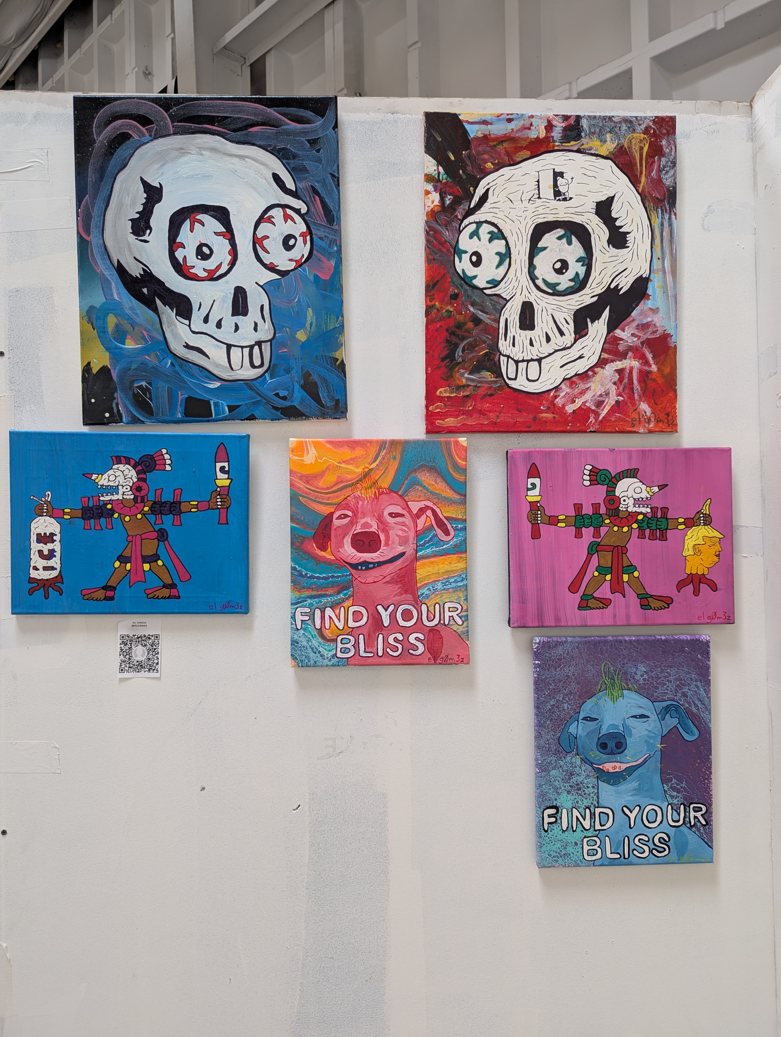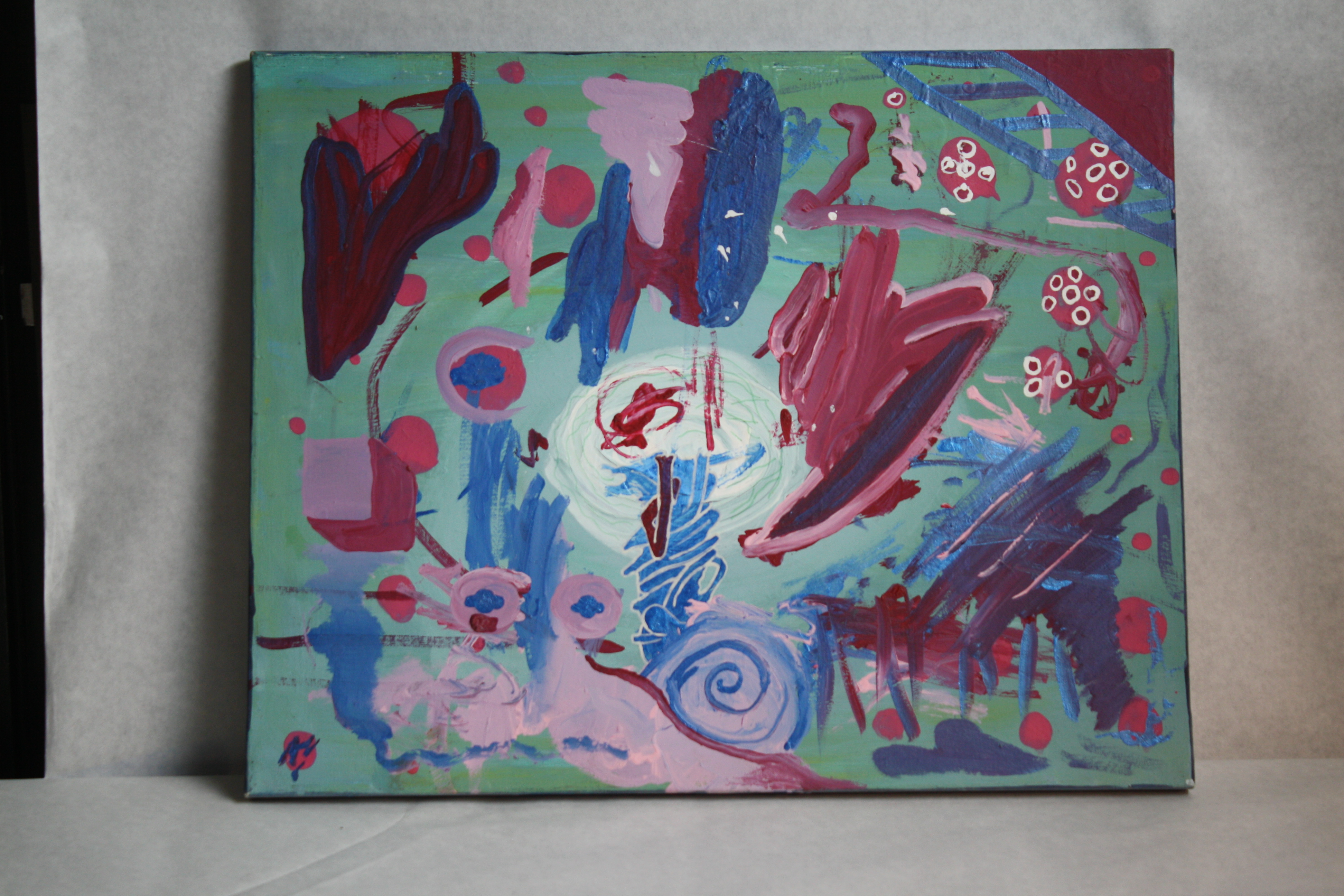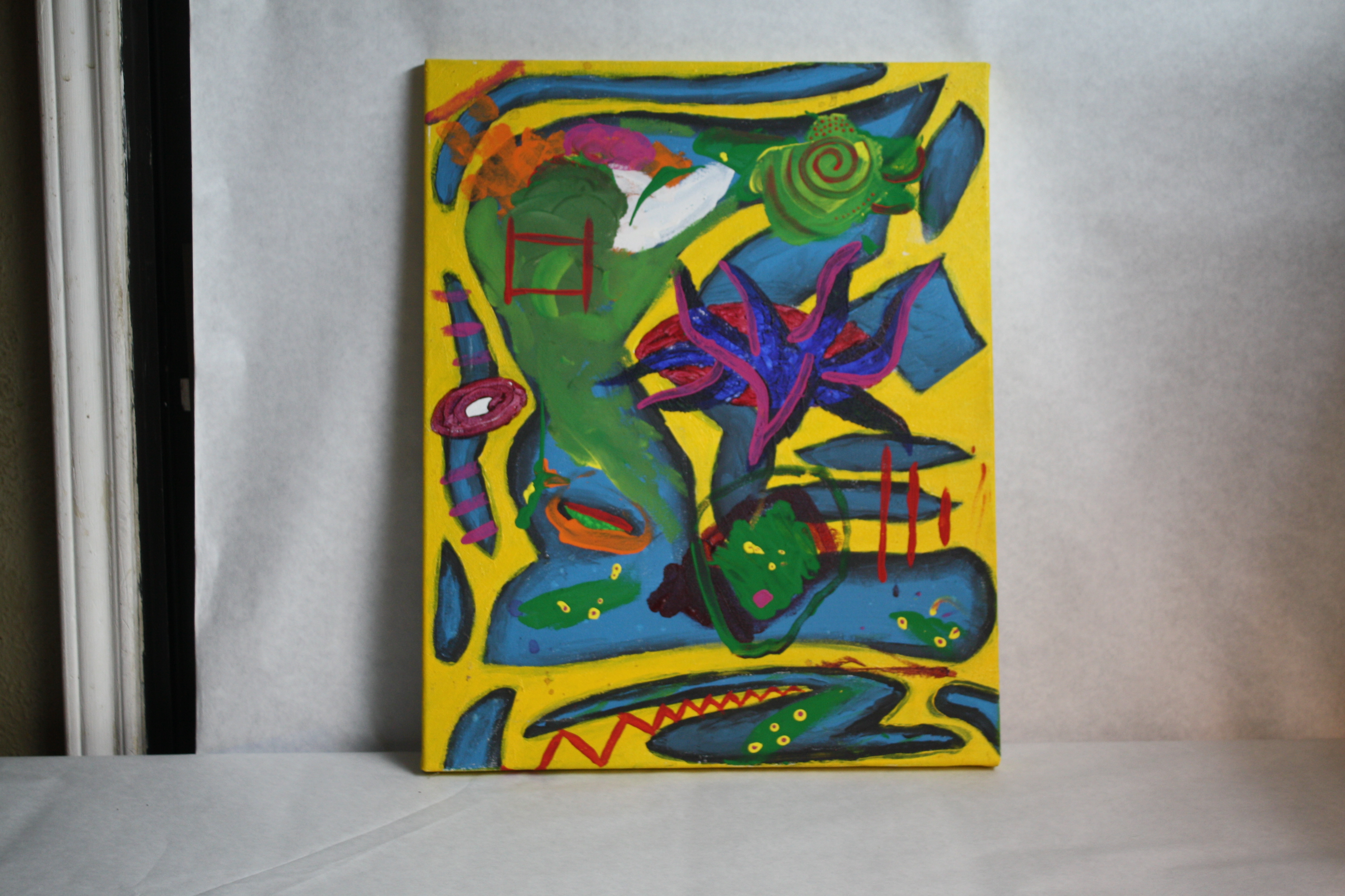Muchas de estas pinturas fueron creadas en conjunto con mis hijos Leo y Pablo. La tecnica es simple, posiciona un lienzo en el suelo y acomoda varias pinturas alrededor. Permitele a los niños escoger los colores, y las cantidades, Dejalos que pinten y hagan lo que se les de la shingada gana dijeras. Al mismo tiempo yo me tome la libertad de hacer lo mismo, y juntos fuimos creando la base de la pintura. De ahi se trabaja con pinceles, dedos, patas, lo que sea, el chiste es divertirse. Yo como adulto y la mente ya corrupta le fui metiendo pincel y mas o menos creando cosas que veia en mi mente.