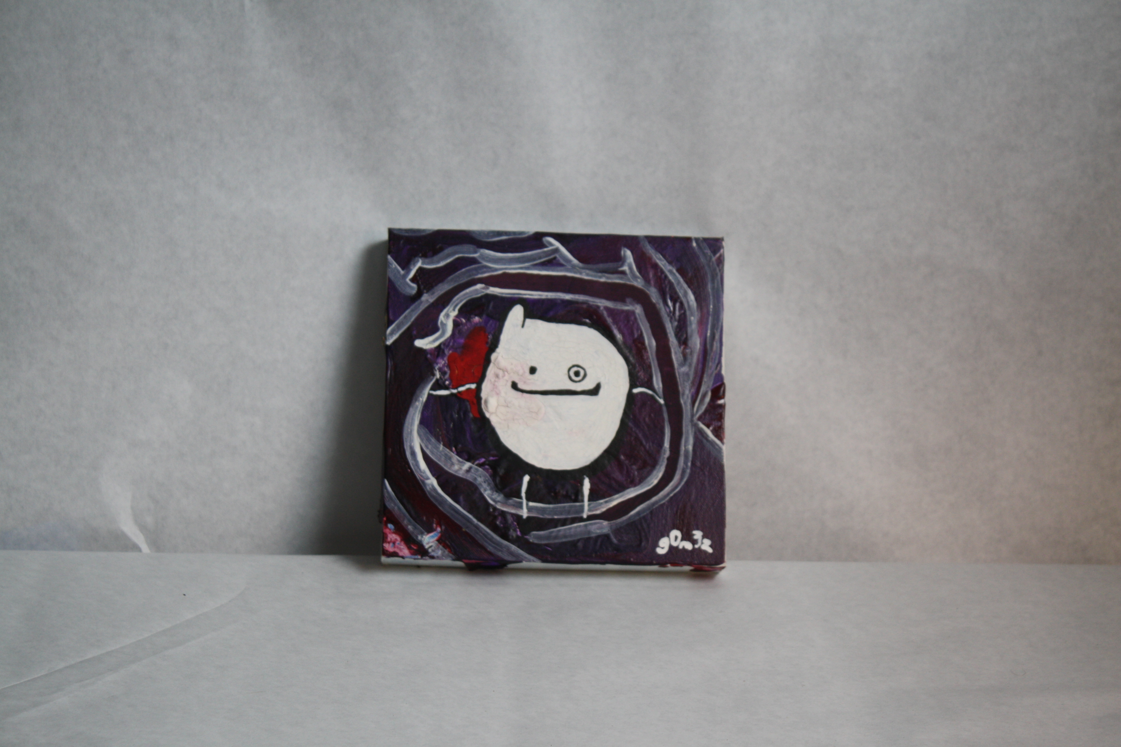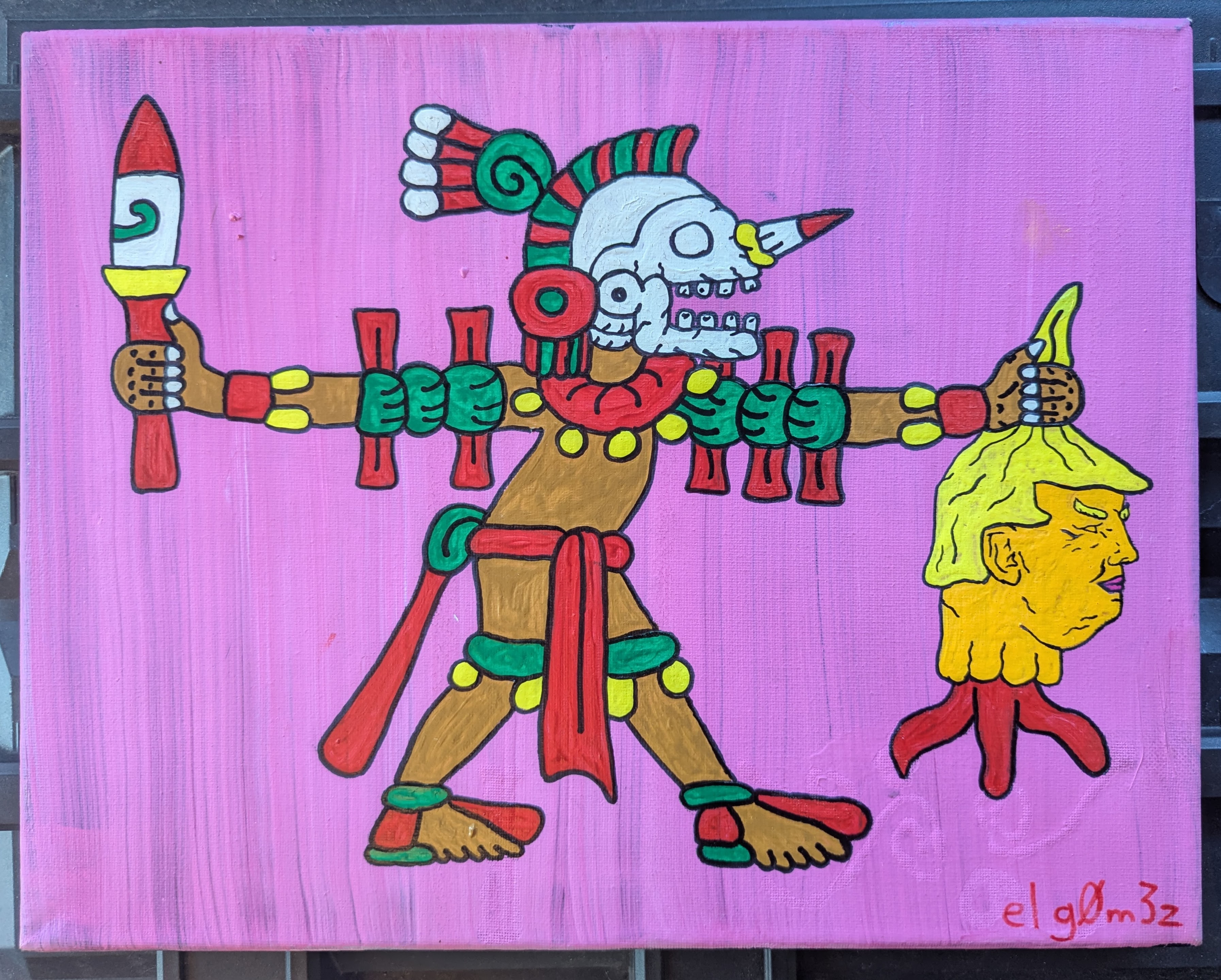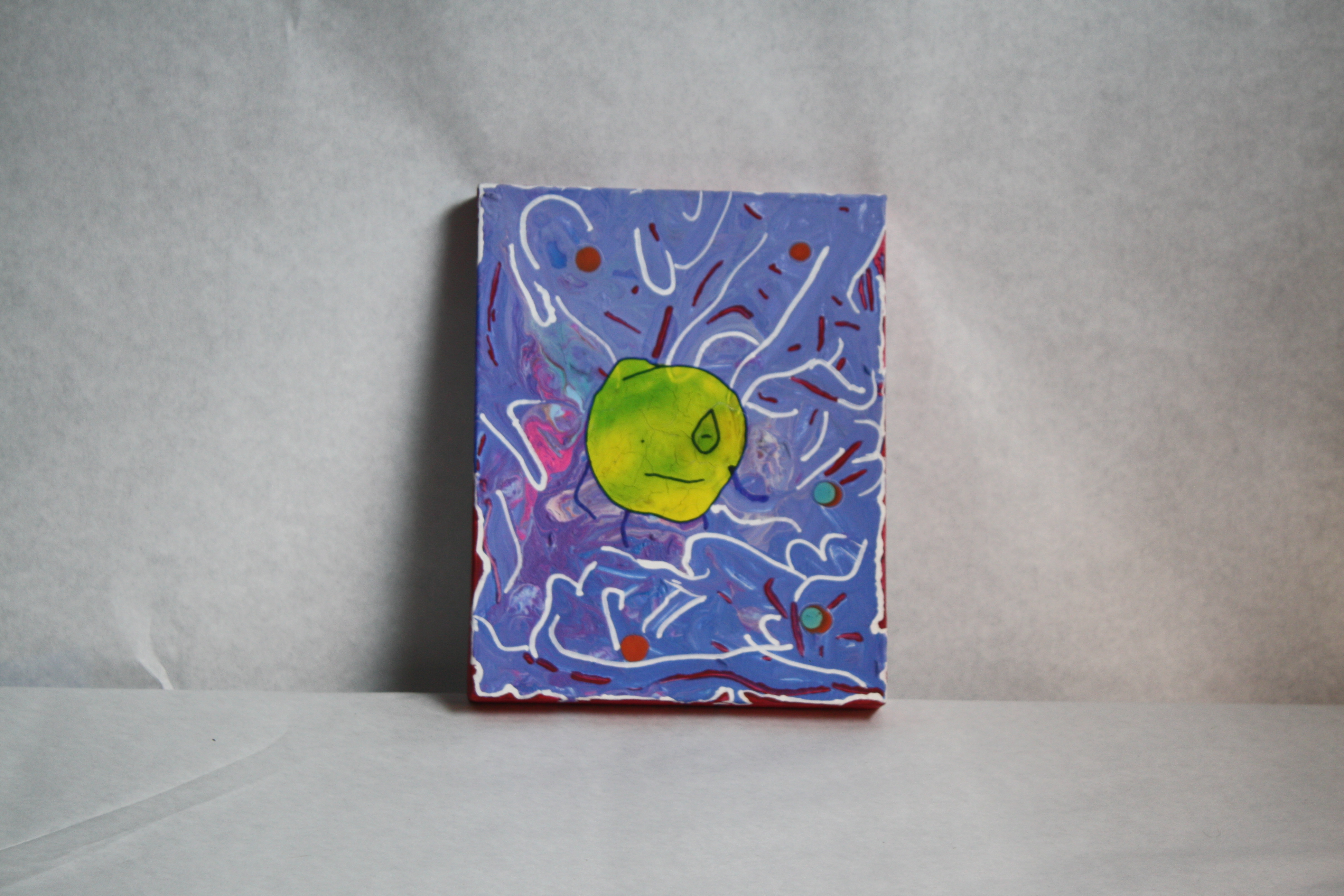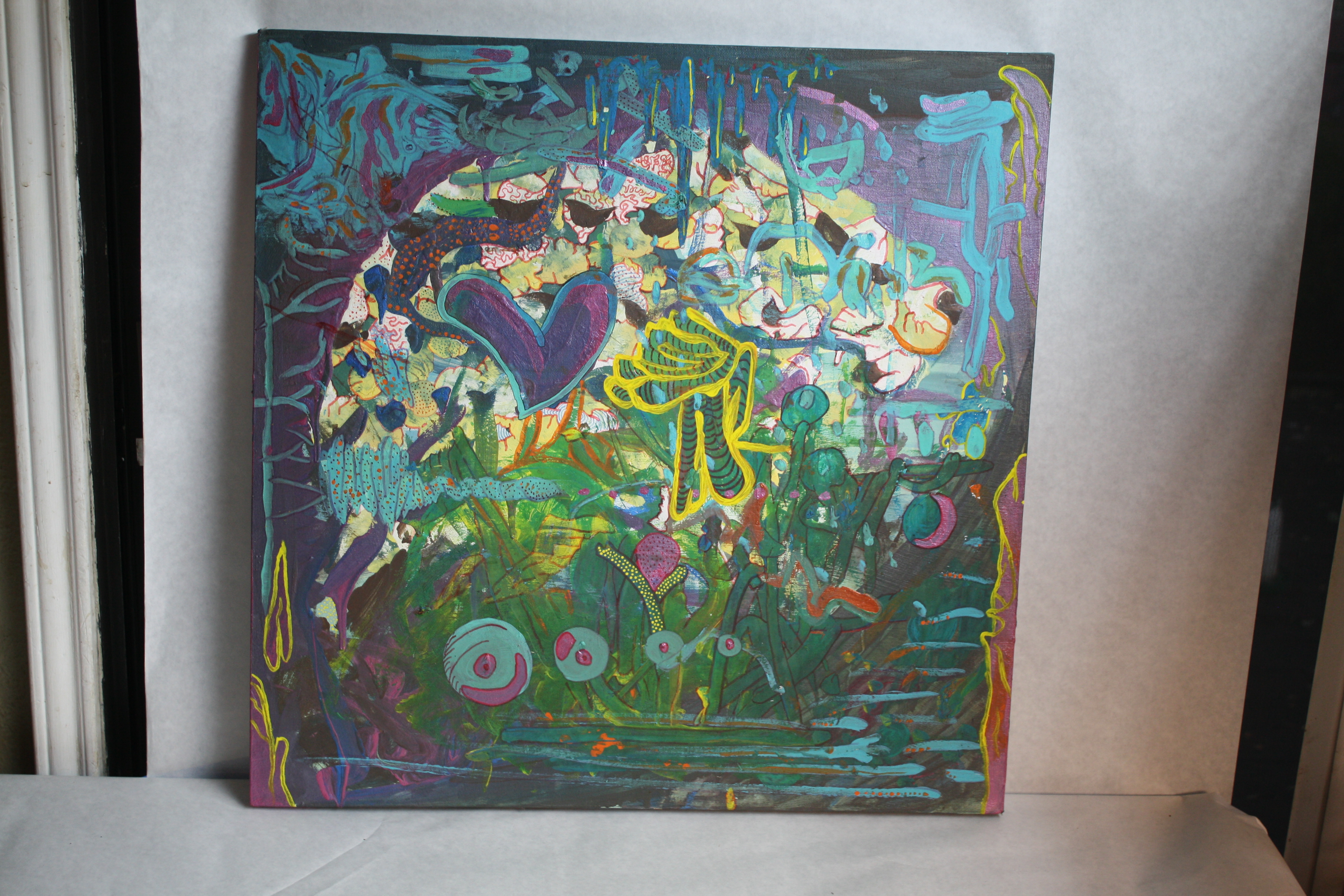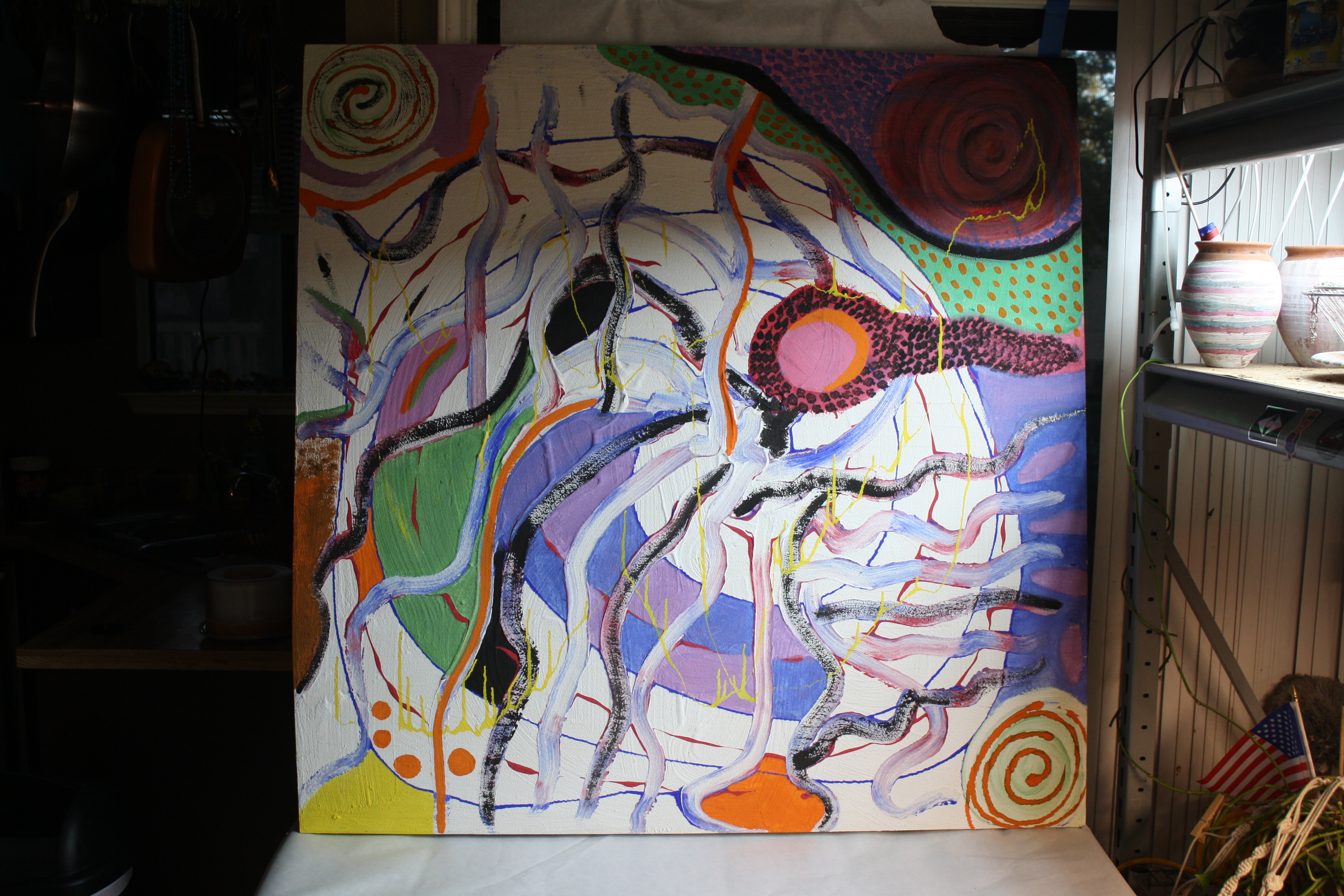 Muchas de estas pinturas fueron creadas en conjunto con mis hijos Leo y Pablo. La tecnica es simple, posiciona un lienzo en el suelo y acomoda varias pinturas alrededor. Permitele a los niños escoger los colores, y las cantidades, Dejalos que pinten y hagan lo que se les de la shingada gana dijeras. Al mismo tiempo yo me tome la libertad de hacer lo mismo, y juntos fuimos creando la base de la pintura. De ahi se trabaja con pinceles, dedos, patas, lo que sea, el chiste es divertirse. Yo como adulto y la mente ya corrupta le fui metiendo pincel y mas o menos creando cosas que veia en mi mente.