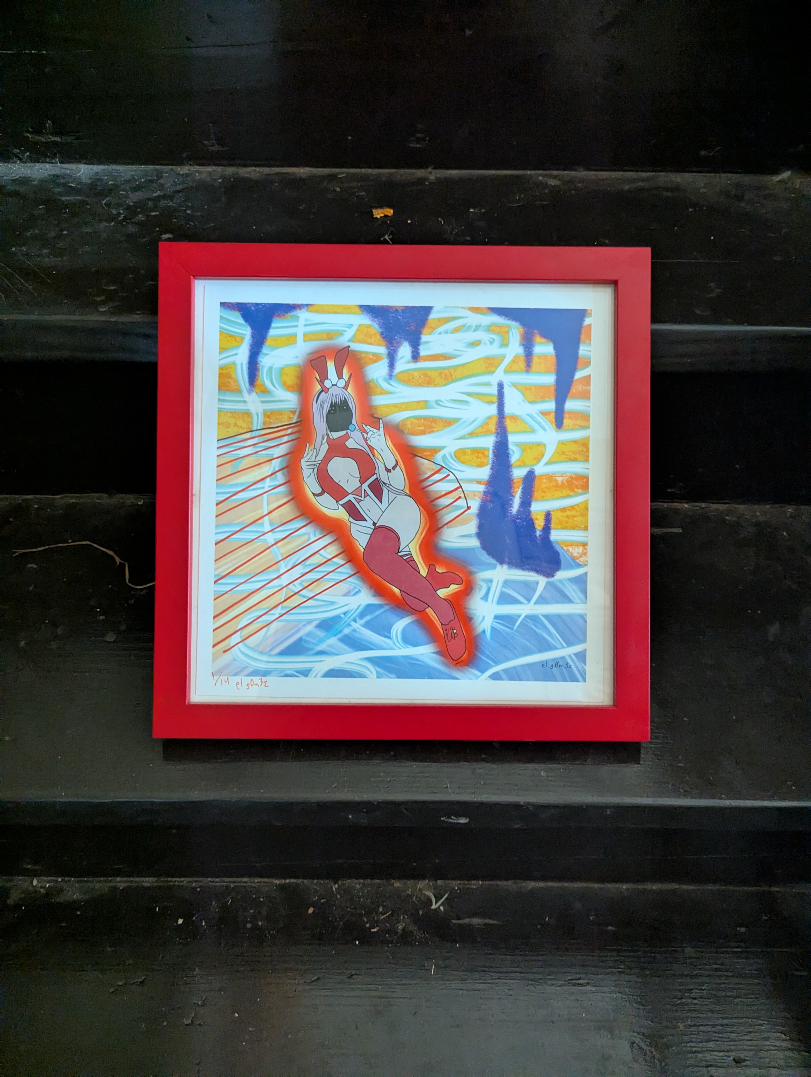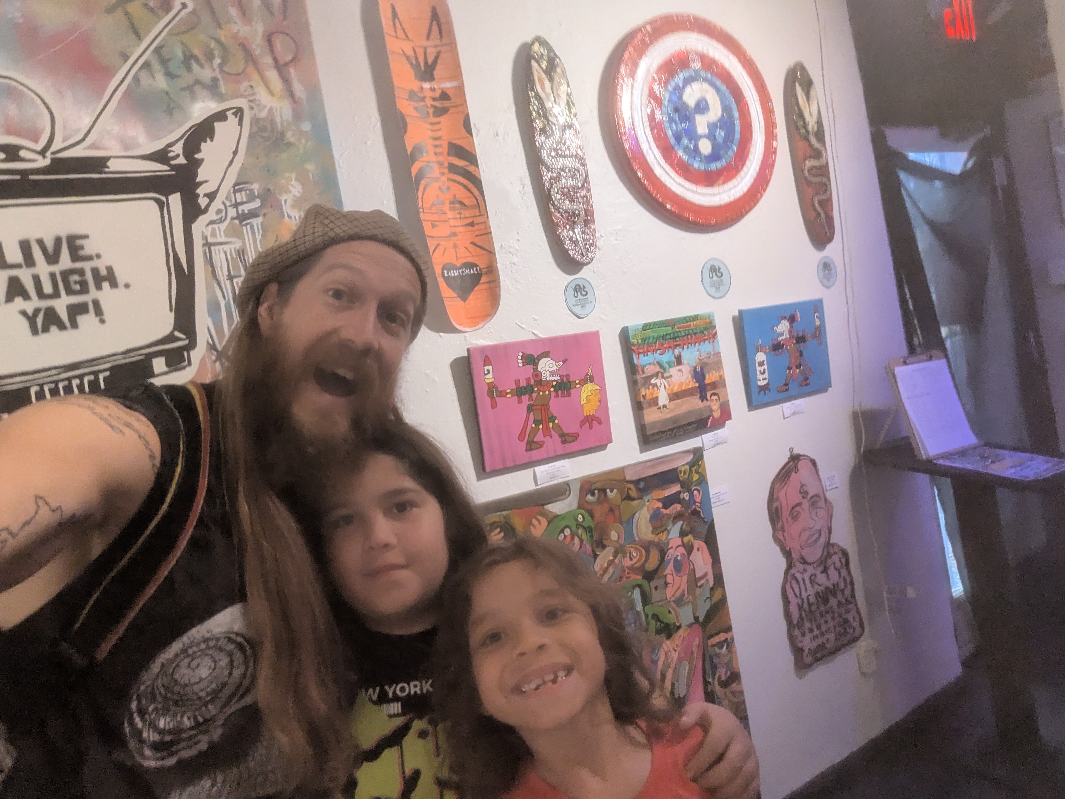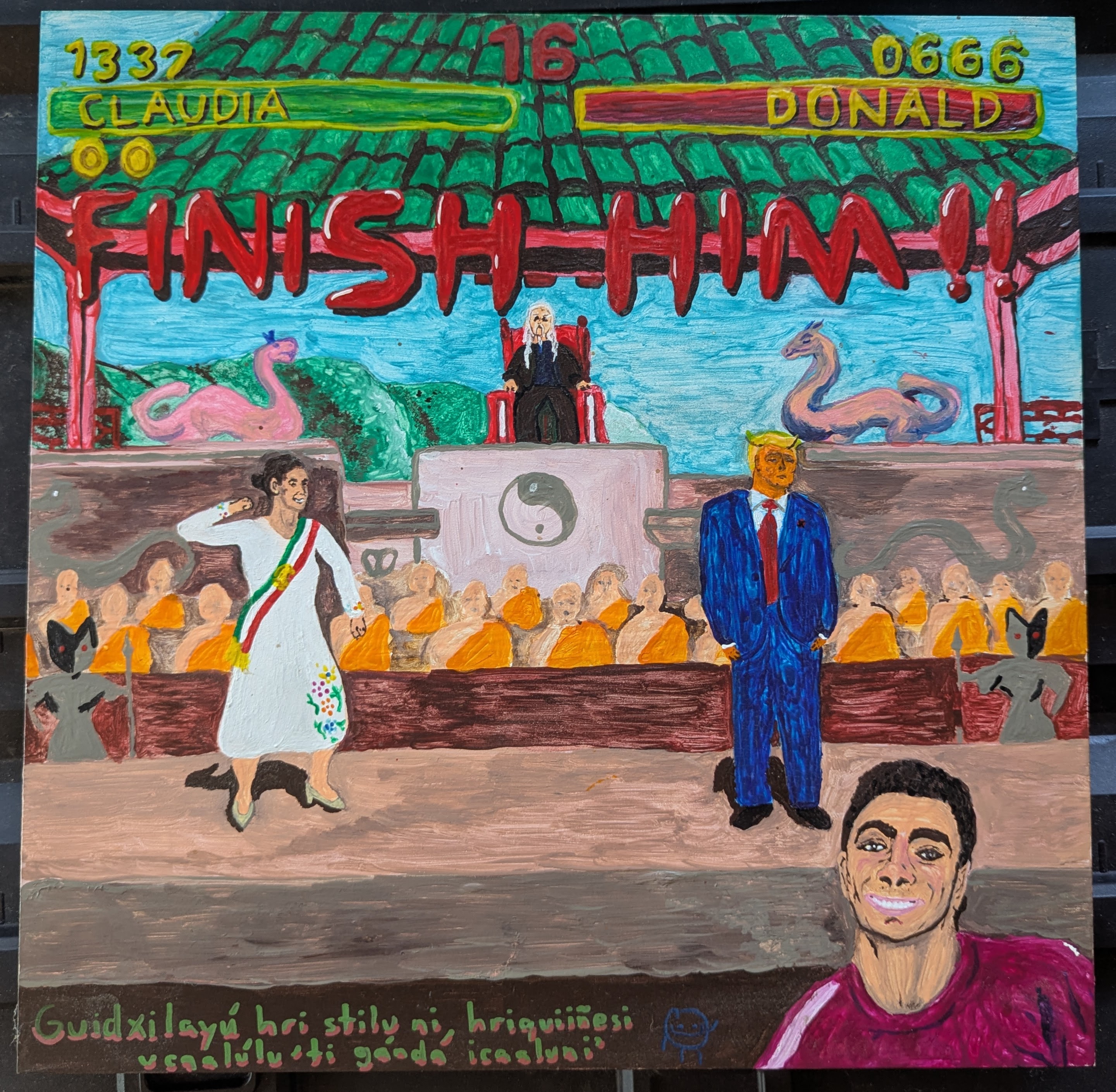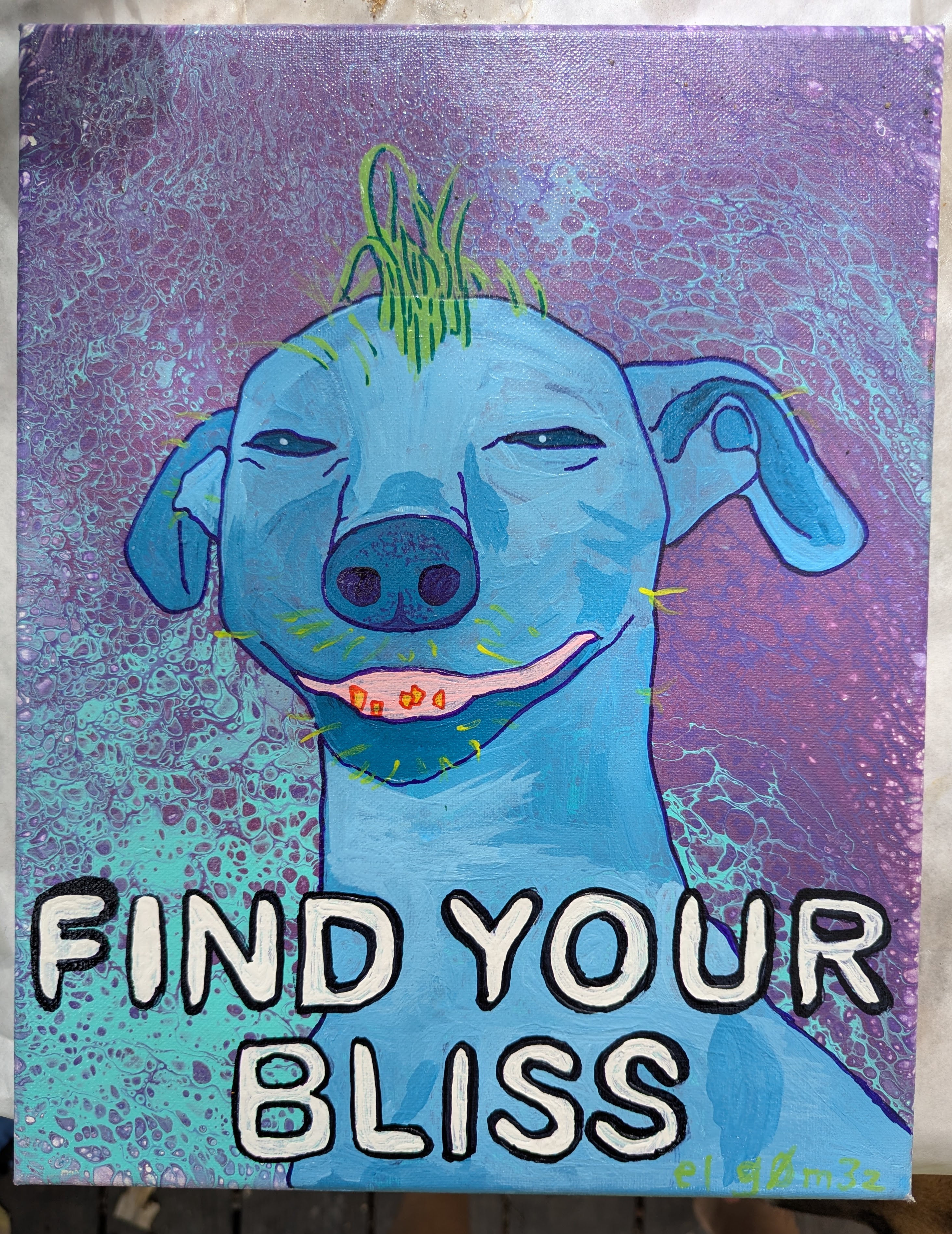 Muchas de estas pinturas fueron creadas en conjunto con mis hijos Leo y Pablo. La tecnica es simple, posiciona un lienzo en el suelo y acomoda varias pinturas alrededor. Permitele a los niños escoger los colores, y las cantidades, Dejalos que pinten y hagan lo que se les de la shingada gana dijeras. Al mismo tiempo yo me tome la libertad de hacer lo mismo, y juntos fuimos creando la base de la pintura. De ahi se trabaja con pinceles, dedos, patas, lo que sea, el chiste es divertirse. Yo como adulto y la mente ya corrupta le fui metiendo pincel y mas o menos creando cosas que veia en mi mente.
